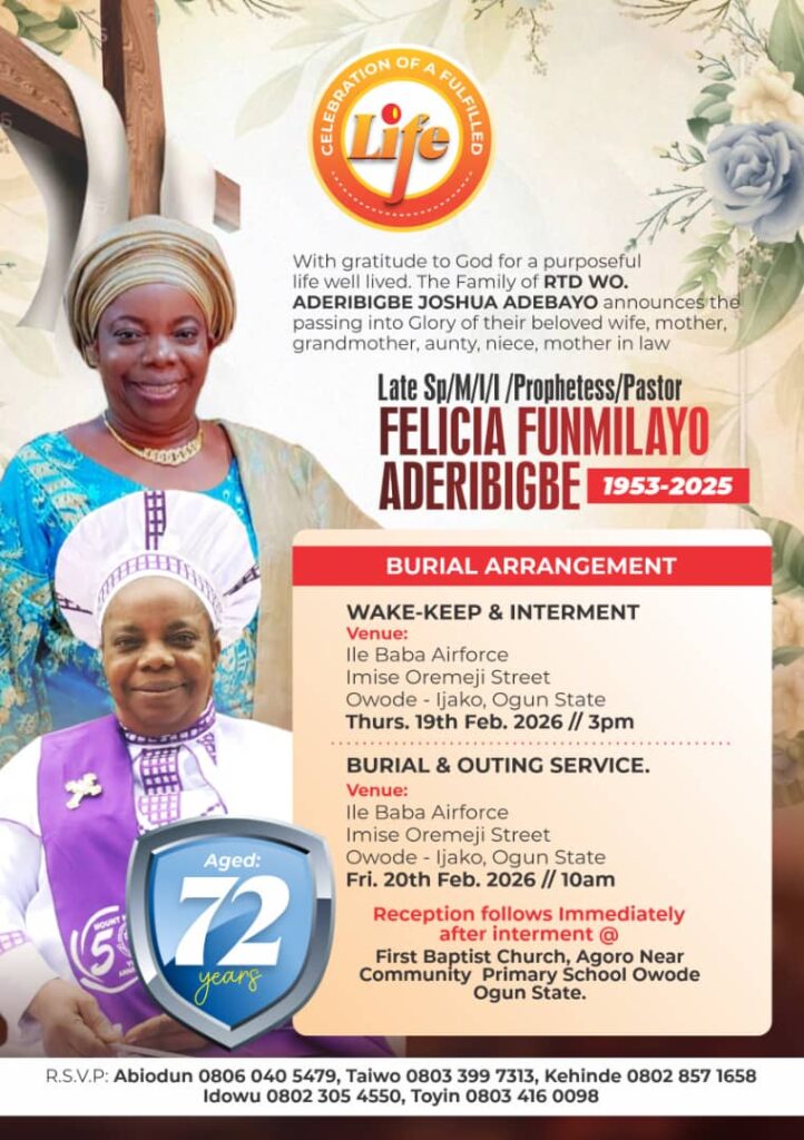 The Burial is scheduled for 19th and 20th February, 2026, with the Wake Keep and Interment taking place on Thursday, 19th February at Ile Baba Airforce, Imisi Oremeji Street, Owode Ijako, Ogun State by 3pm.